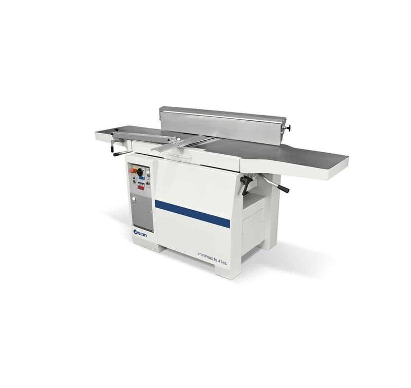 The Minimax FS 41ES is a professional grade, heavy-duty, long bed jointer/planer combination machine designed to meet the needs of the most demanding environments. It features cast iron tables, tilting fence, four-post planner pillar, and quick changeover. This technology gives an exacting finish while reducing ambient noise decibel output significantly. – 10 Horsepower motor – Additional overturning fence for processing of thin workpieces – Cast Iron mortiser with 120mm exhaust hood complete with 16mm chuck Strokes (X-160mm), (Y-120mm) and (Z-105mm) – Dedicated Surface Planer fence (1200mm x 150mm) – Digital-mechanical readout on planer height (1/10mm) – Parallelogram jointer tables – 4 dust-protected planer table columns with trapezoidal threading – Helicoidal thicknesser infeed roller – Sandblasted steel thicknesser outfeed roller – Pre-setting for mortiser – LED readouts & powered movements – American-style jointer guard – Wheels for machine movement – XYLENT Technology Helicoidal Cutterhead with 66 knives – XYLENT Maintenance kit with 10 additional knife inserts (15mm x 15mm x 2.5mm) ** The Minimax FS 41ES comes with an American-style spring-loaded jointer guard and does not come with the pictured European guard in the attached pictures *