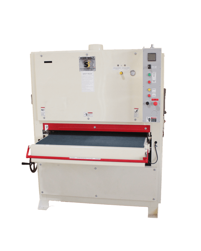 • The 43″ Wide Belt Sander features a 75” belt, providing 25% more abrasive surface than the smaller 60” belt machines. The larger belt translates to increased capacity, less heat accumulation, less maintenance and fewer belt replacements. With a fully adjustable platen these sanders will deliver a perfect smooth finish every time. • Standard Equipment - Photo electric belt tracking. - Pneumatic belt tension. - 2 ½” graphite covered felt pad and adjustable platen. - 2 rubber-covered pinch rollers 2 ½” OD. - 2 machined idler rollers 4 ¼” OD with 1″ bearings. - Rubber-covered contact roller 5 ¼” OD with 1 ⅝” drive bearing. - Conveyor table set on four 1″ acme thread jackscrews. - 2 height adjustment indicators. - 6″ internal dust chute. - 5 emergency stops. - 3 year warranty.