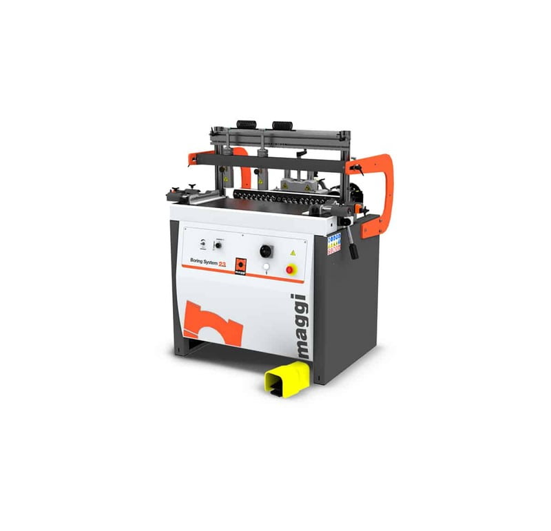 The Maggi System 23 Boring Machine provides a 23 spindle 32 mm universal drilling solution, with horizontal and vertical boring capabilities and pneumatic tilting of the boring unit with locking points from 0 to 90 degrees for quick set-up at any angle. Accurate positioning of the boring unit to the table with digital readout 0 to 2.5″ adjustable drilling depth with patented spiral setting device (2) patented quick release material clamps with auto-setting to firmly hold material to table Powerful 2 HP motor 37″ x 13″ cast iron table Side fences with mechanical digital readout for quick and accurate setting 120″ back fence with (2) stops – Maximum stroke 300 mm (12″) Fixed stop at 37 mm for hinges Foot actuated pneumatic clamps and drill cycle Uses 11 LH (red) and 12 RH (black) boring bits Includes: Magnetic Starter with overload protection and (23) quick change chucks Dust Outlet: 3″ Net weight: 630 lbs Dimensions: 51.7″ x 37.8″ x 50″ Tall Crated Dimensions: 42.2″ x 37.4″ x 40.5″ Tall Crated Weight: 705 lbs.