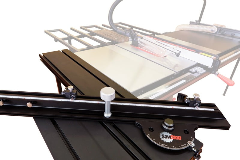 Engineered and finished to fit your SawStop Contractor, Professional Cabinet or Industrial Cabinet Saw, the Sliding Crosscut Table is the finest quality crosscut table available. It delivers repeatable, accurate results with ease and beauty. • This sliding table is built for versatility. Micro-adjust for detail cuts, and crosscut full sheets with the 55″ travel and 48″ crosscut capacity. • The fence is at least 15% larger than typical crosscut sliders, spanning 43″ and extending past 58″. The oversize fence miter turns at the twist of a single knob, and measures to a full 60 degrees. • Adjust the table to fit your needs. Easily slide the fence in for blade proximity, and choose a flush or “maximum throw” installation to fit your shop and space requirements. • Large flip-stops with scale and magnified lenses help ensure accurate, repeatable cuts every time.