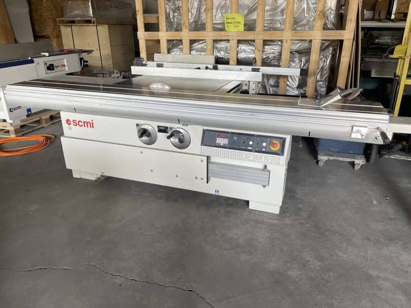 SCMI 10′ programmable sliding table saw Year 2004 Manual raise, lower and tilting of the main blade Main blade up to 14″ with 1″ arbor Include Scoring Overarm guard included but not shown in the photo Programmable controlled rip fence with digitals on the front of the machine 9hp main motor 230v, 3 phase 60hz