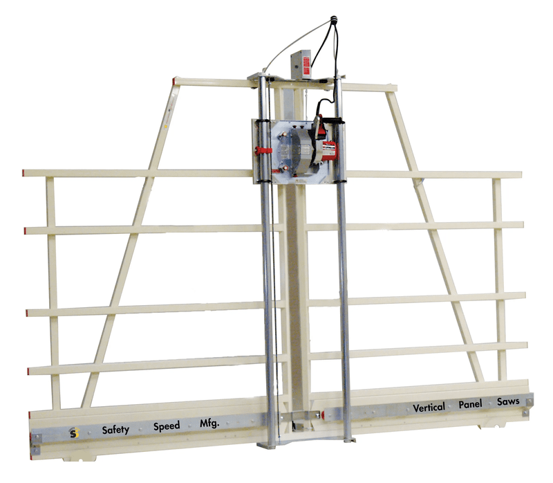 • The H6 Panel Saw provide a 74″ crosscut, ideal for cutting a 10′ X 6′ piece of material, up to 1.75″ thick while only occupying 30 square feet of floor space. A motor made by Milwaukee Tool is currently used on the H6 vertical saw. • Standard Equipment - Zinc plated 1¾”steel guide tubes. - 4 Nylatron roller bearing systems. - Milwaukee Tool Motor - Adjustable vertical and horizontal rulers. - Quick change from vertical to horizontal cutting. - Thin material pressure guard. - Injection-molded plastic material rollers. - Spring loaded counter balance system. - Integrated dust collection bonnet. - Extended warranty. - TUV certified to UL/CSA standards