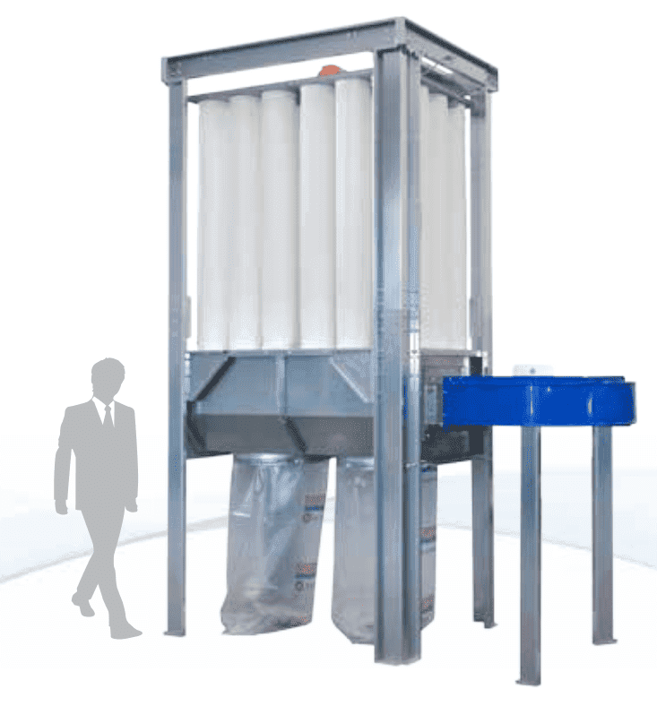 10 HP, 5000 CFM The SHK Series enclosureless dust collector is designed for the collection of sawdust and is ideal for indoor use in smaller wood shops, or for more localized extraction dedicated to specific woodworking machinery. The optional mechanical shaker cleaning system increases production time by reducing labor required to maintain filter efficiency. The bags can be mechanically shaken after the fan is switched off (per NFPA guidelines). The filter housing supports anti-static polyester filter sleeves fixed by double snap rings into a tube sheet, which is mounted atop the material collection hopper that empties the collected material into plastic bags. The collector frame is made of durable 14 GA galvanized sheet steel. The material handling fan is rated for S1 duty cycle (continuous running), and features a high-efficiency IP55 motor. The SHK Series collector is available with several waste discharge options: Hopper and waste bags (standard, as shown). Haul-away forklift dump bin. Waste barrels with viewing windows. Collection hopper with rotary screw extractor and rotary air lock (leg extensions available for additional clearance below discharge). Closed-loop material transfer system including rotary screw extractor, rotary air lock, material transfer fan and material transfer ductwork. Enclosure panels are available for locating SHK Series units outdoors. All SHK Series units are capable of retrofit for locating outdoors. Additional safety equipment is available for spark detection & extinguishing, deflagration relief & containment, and abort for return air applications.