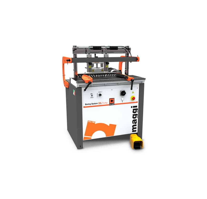 The Maggi System 21 Prestige Boring Machine provides a 21 spindle 32 mm universal drilling solution, with horizontal and vertical boring capabilities and pneumatic tilting of the boring unit with locking points from 0 to 90 degrees for quick set-up at any angle. Accurate positioning of the boring unit to the table with digital readout 0 to 2.5″ adjustable drilling depth with patented spiral setting device (2) Patented quick release material clamps with auto-setting to firmly hold material to table Powerful 2 HP motor 34″ x 13″ cast iron table Cast iron side fences with ruler and magnifying glass Mirror imaging device to ensure quick and accurate set-up of the side fences 120″ back fence with (2) stops – Maximum stroke 300 mm (12″) Fixed stop at 37 mm for hinges Foot actuated pneumatic clamps and drill cycle Uses 10 LH (red) and 11 RH (black) boring bits Includes: Magnetic starter with overload protection and (21) quick change chucks Dust Outlet: 3″ Net weight: 605 lbs Dimensions: 40.5″ x 40.5″ x 50″ Tall Crated Dimensions: 42.2″ x 37.4″ x 40.5″ Tall Crated Weight: 685 lbs