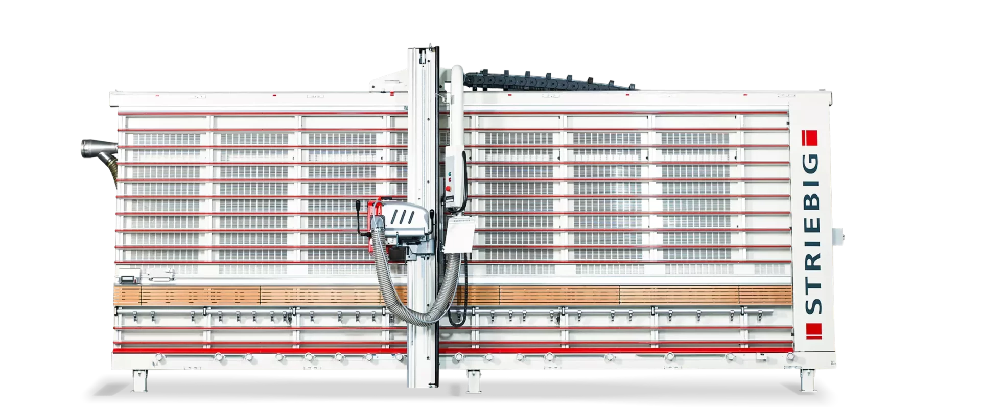STRIEBIG “COMPACT” (4164) PANEL SAW - Swiss made quality for accuracy and durability! - One-piece fully welded frame, suitable for free-standing or wall-mount installation - Heavy- duty support rollers with integral panel stop assembly - Full length heavy-duty center shelf with moveable aluminum fingers - Built-in wood small parts backing support across full length of center shelf - Special measuring flip stop with “double-flip action” for use with small parts - Automatic, mechanical, upward-shifting support grid to keep off-cuts from binding grid - New, highly efficient dust system with hose enclosed in cable chain and can be run to either end of the frame; additional port at far-right end of frame; note: requires connection to a collector - Cutting stations 40” apart (1 meter spacing available for purely metric shops-factory ordered) - 5-1/4 hp, 3-phase motor with electric brake and noise level below 80dB - 250 mm (9-7/8”) HFG (hollow face), 48T, carbide saw blade - Template bar accepts optional adjustable stops for setting common rip cuts - Auto-engaging riving knife for safety Specifications: Cut capacities: 10’ 2”W x 5’ 4” Hvert, 5’ 1/2” Hhor; Depth 2-3/8” (60mm) Machine dimensions: 13’ 10”L, 7’ 10” H (8’ 6” w/repeat rip device), 4’ 8” D (from wall) Weight: 1340 lbs. (approx. 1855 lbs. shipping) Requirements: Electrical: 3-phase, 208 or 240V (20A) or 480V (10A); must specify voltage; right side Dust collection: 500 cfm/port; 2x 100mm (4”) ports (second connection at bottom right corner of frame is optional and hose is not provided)